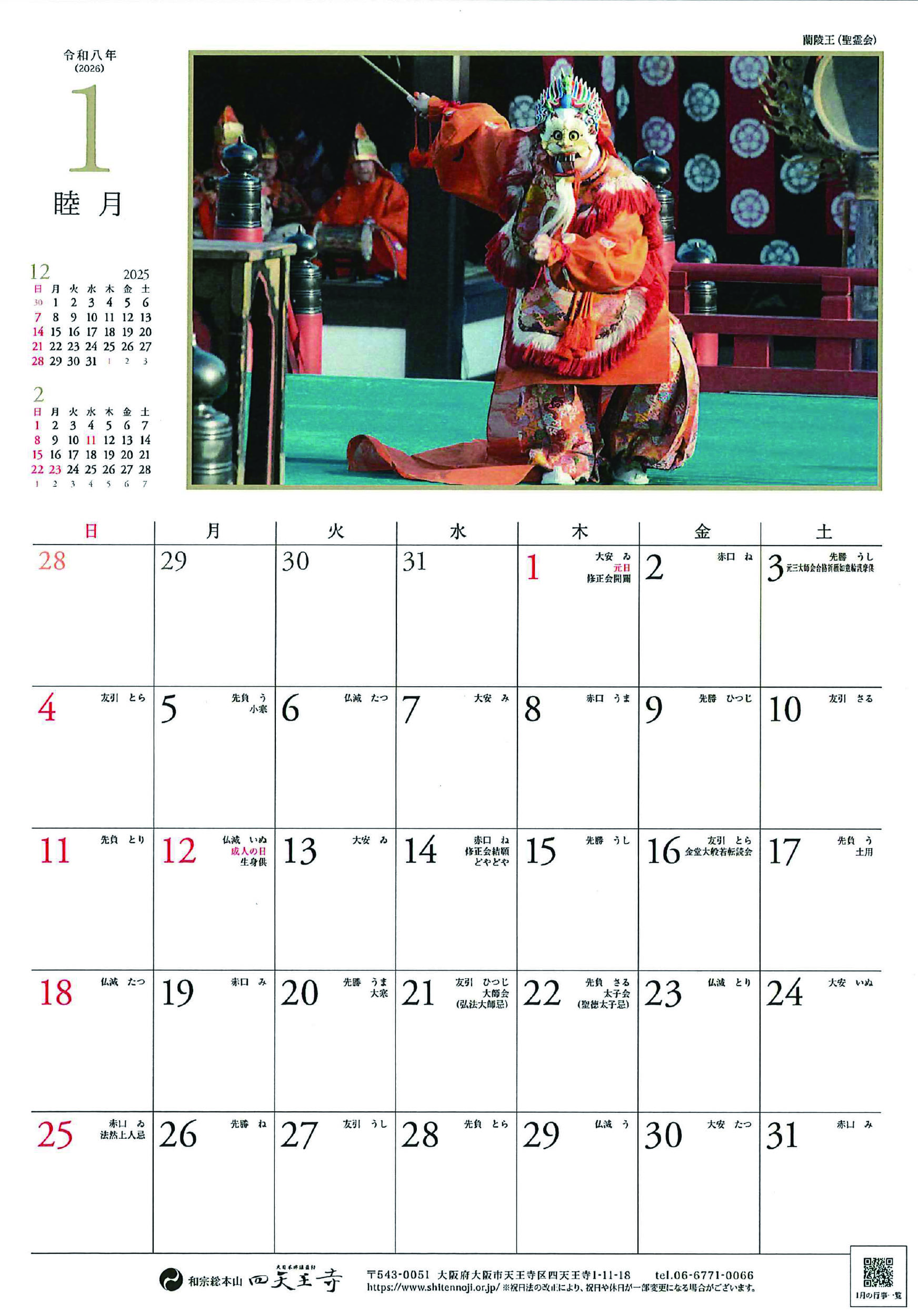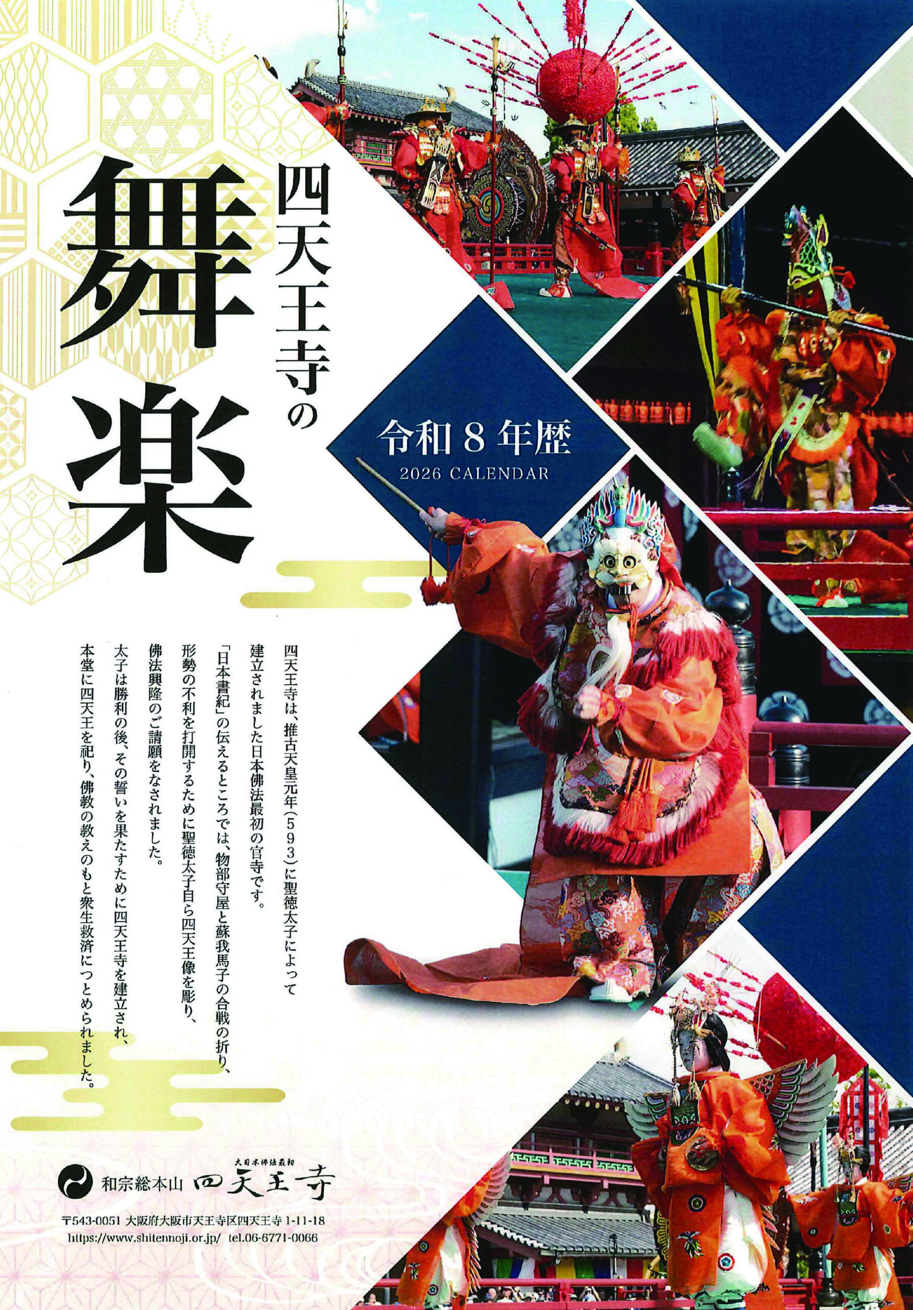 今年度は「四天王寺の舞楽」四天王寺オリジナルカレンダーとなっております。
