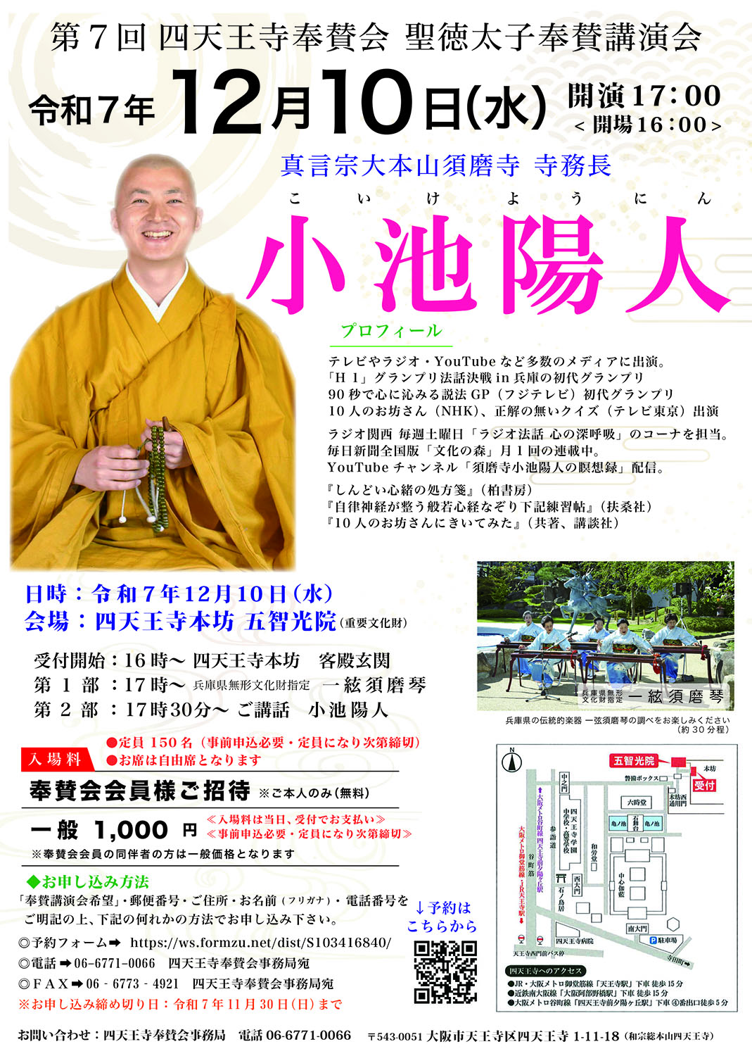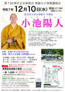 令和7年度 四天王寺奉賛会の奉賛講演会は、真言宗大本山須磨寺 寺務長 小池陽人師をお招きし、ご講話を頂戴いたします。