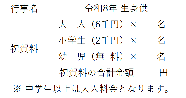 事前申込をされた方は、祝賀料を事前にご志納ください。