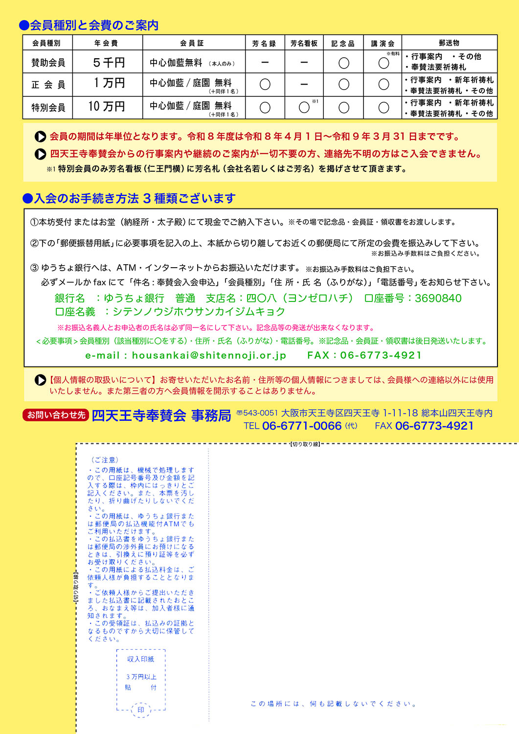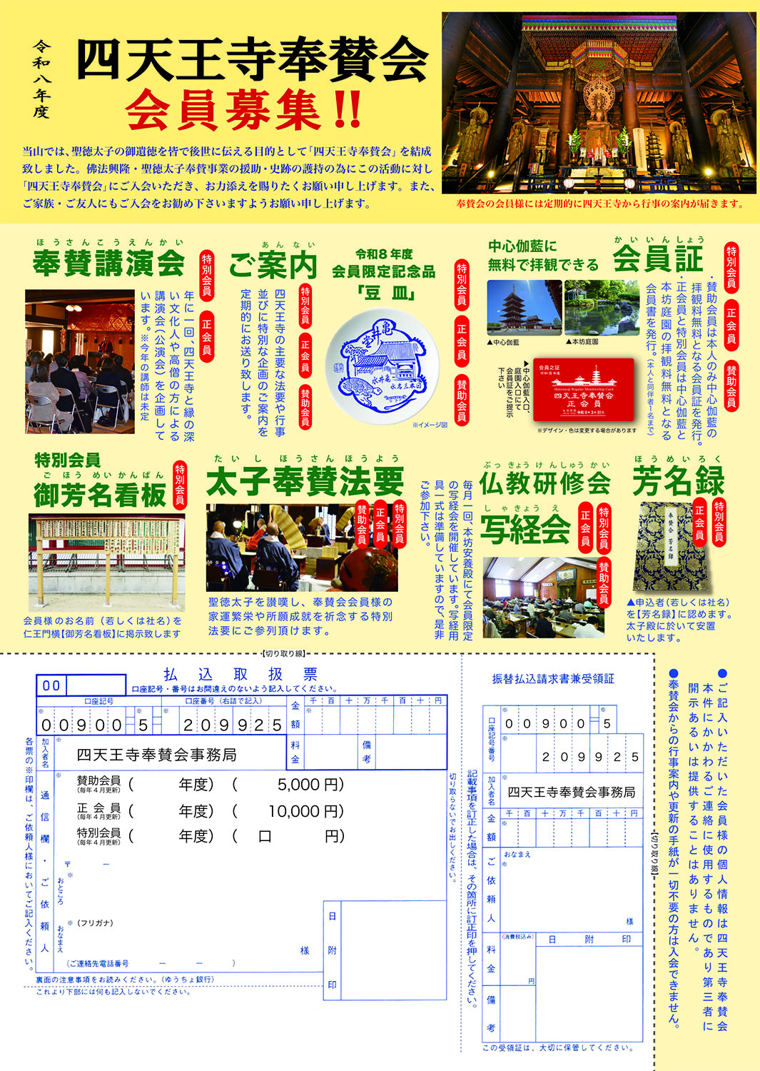 当山では、聖徳太子の御遺徳を共に後世へ伝えることを目的として「四天王寺奉賛会」を結成いたしました。佛法興隆・聖徳太子奉賛事業の援助・史跡四天王寺の護持の為に是非ともご入会いただきたく、またお力添えを賜りたく、お願い申し上げます。すでにご入会いただいている方は、ご家族・ご友人にもご入会をお勧めくださいますようお願い申し上げます。