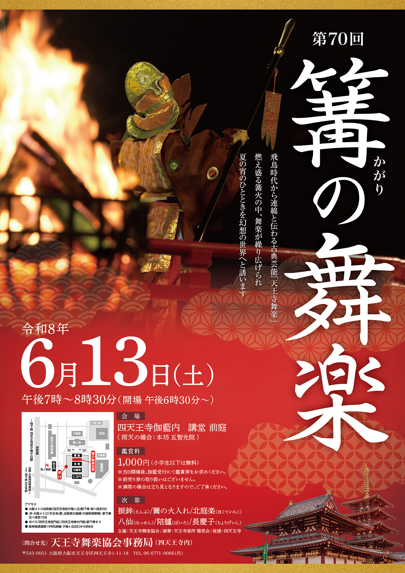 飛鳥時代から連綿と伝わる古典芸能「天王寺舞楽」。燃え盛る篝火の中、舞楽が繰り広げられ夏の宵のひとときを幻想の世界へ誘います。