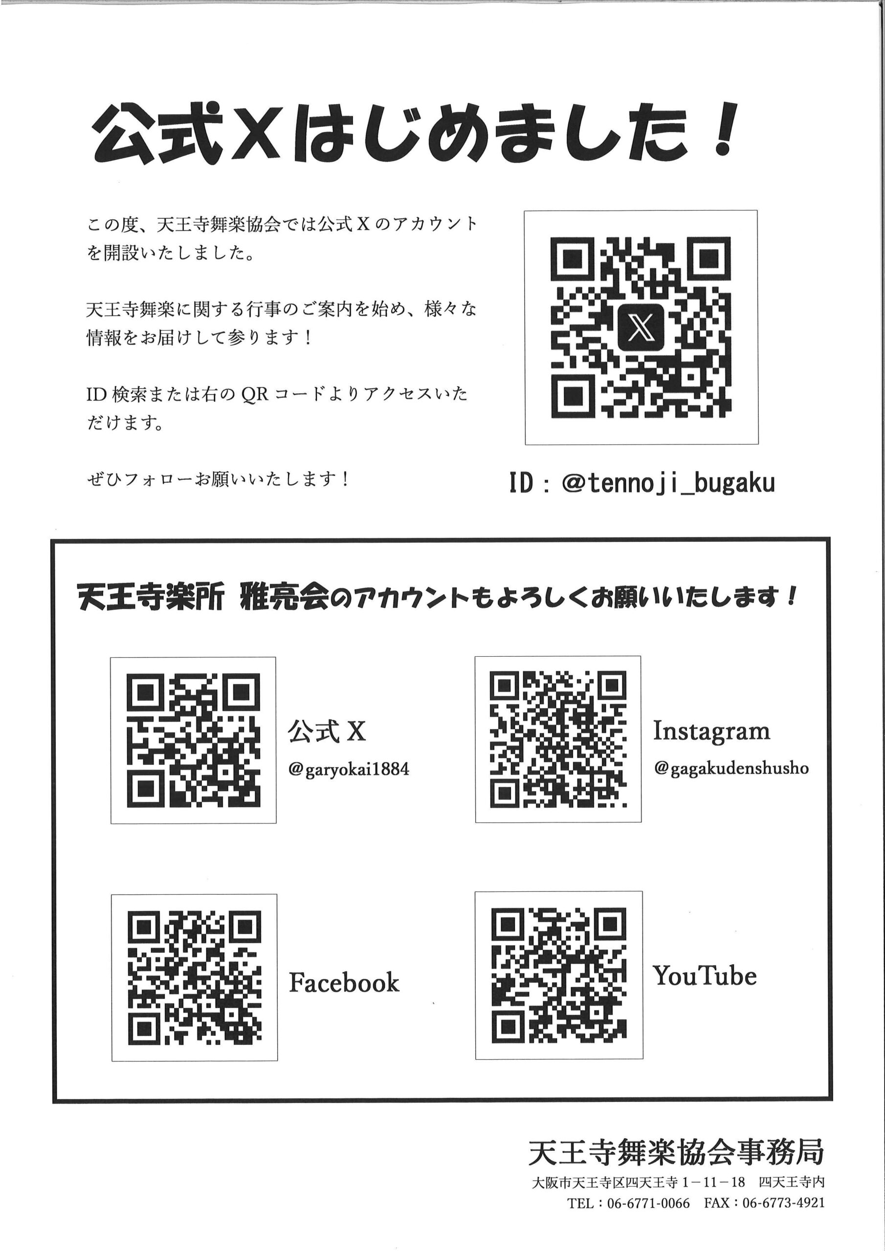 | 問合せ | 天王寺舞楽協会事務局 連絡先:06-6771-0066(代)9:00~17:00 |