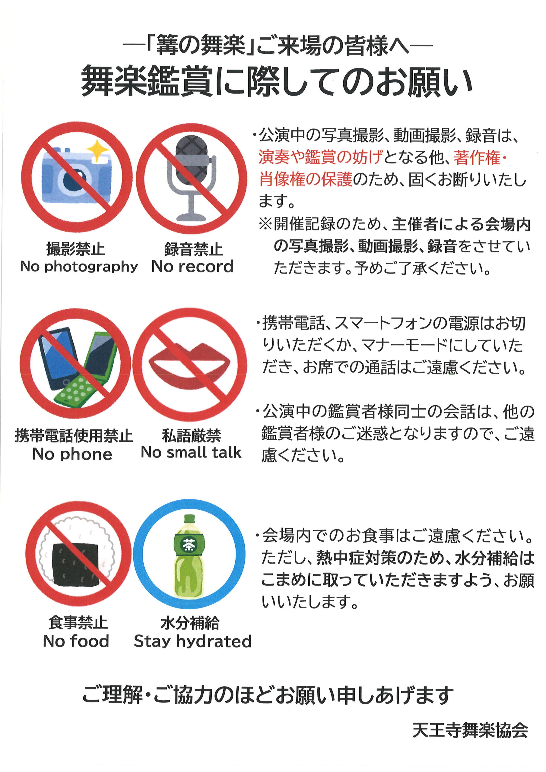 舞楽鑑賞の際は、ご来場いただきました全ての皆様に快適にご鑑賞いただくため、ご理解ご協力いただきますようお願い申しあげます。